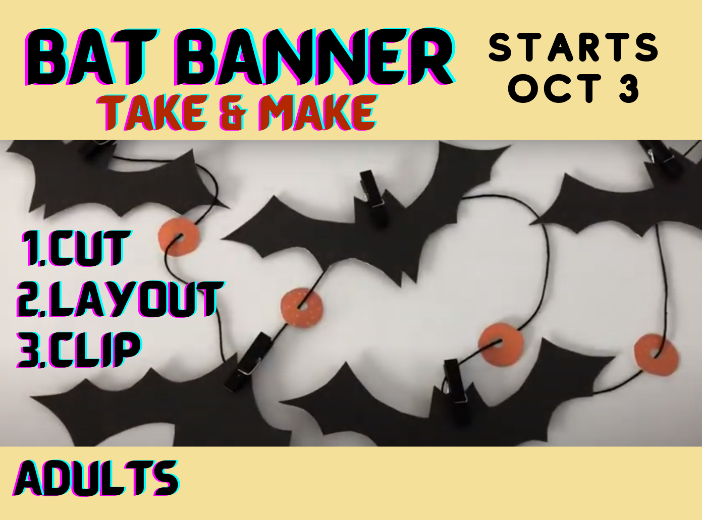 Bat Banner kits are available for pick up at the Circulation Desk in the lobby starting October 3, while supplies last.
