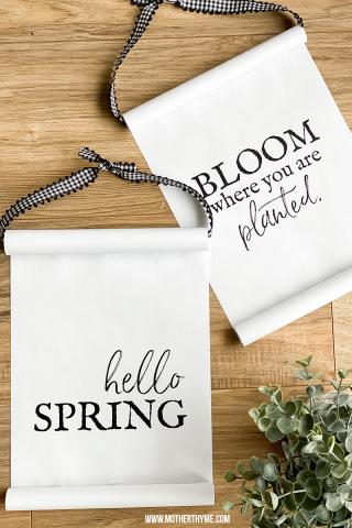 Make an elegant hanging decoration for spring with this craft kit. Includes two spring sayings to choose from, additional paper to create a scroll effect, and a black and white hanging ribbon. You'll need your own hot glue/glue gun (recommended) or craft or school glue may be substituted.