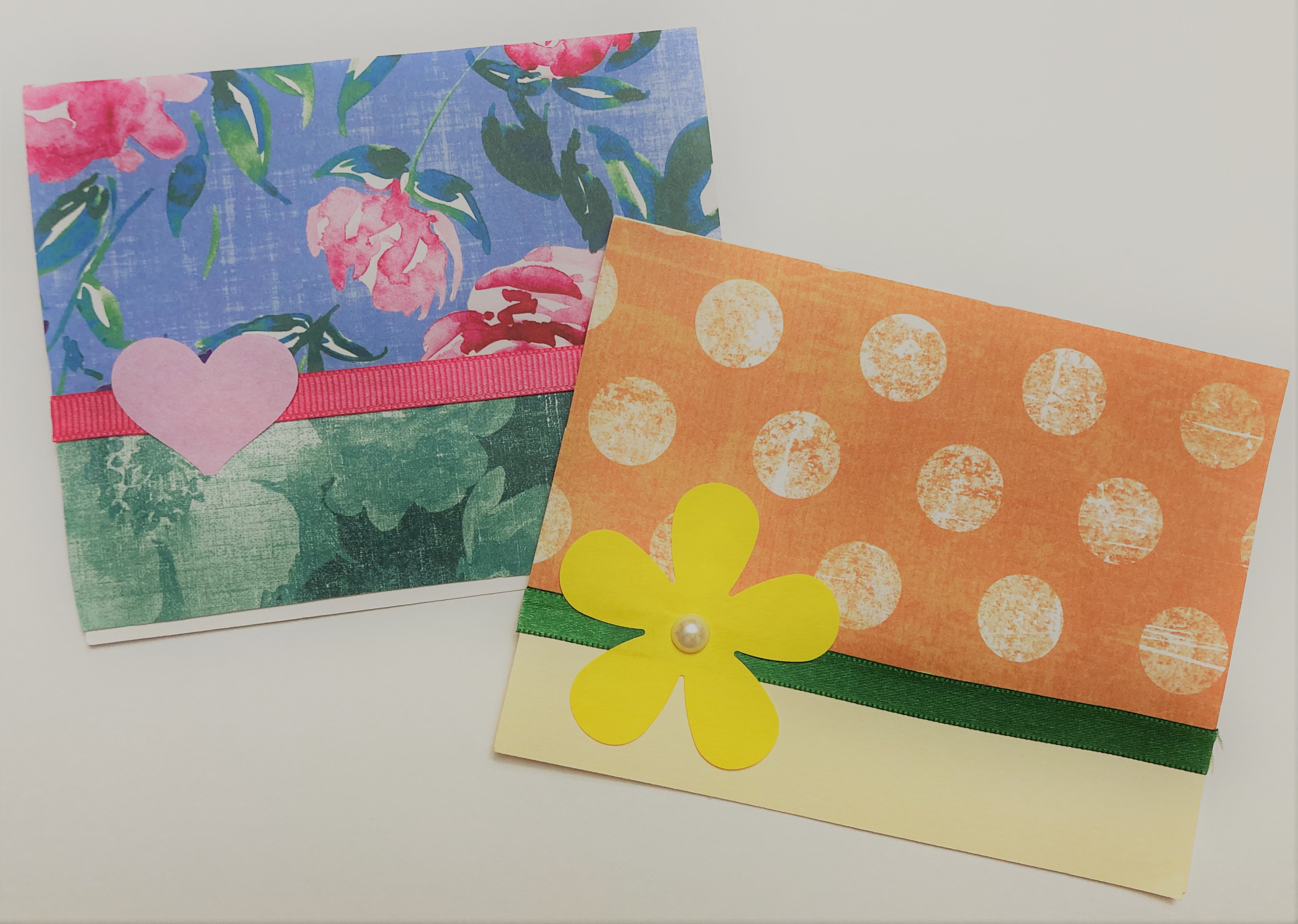 Layer papers, ribbon, and embellishments to create handmade notecards.