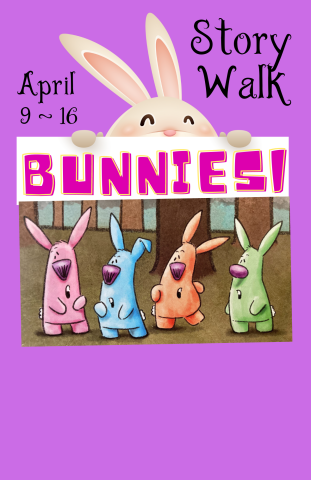 Bunny Storywalk, April 9 - April 16. Take a bunny storywalk! You’ll find a funny bunny story set up for you to read as you walk (or hop) from page to page outside at the library. Look for this pop-up storywalk during daylight hours on nice weather days.
