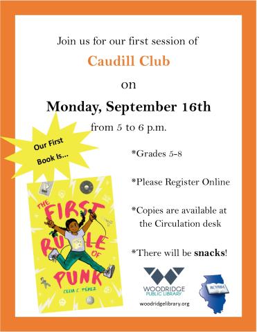 Join us each month to discuss a different nominee from the 2020 Illinois Caudill Readers' Choice List and enjoy treats. For kids in grades 5-8. Online registration begins Monday, August 19. Copies of the book to be discussed are available at the Circulation Desk one month prior to the discussion.