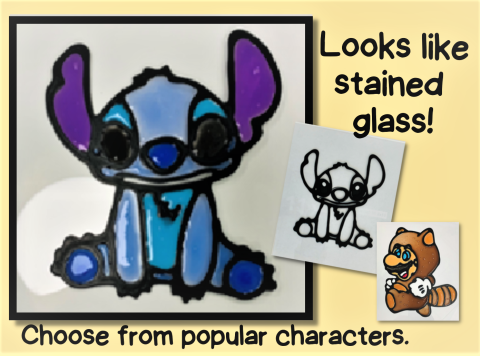 It's not real stained glass, but it sure looks like it is! Choose from one of our pre-made outlines featuring your favorite characters like Stitch, Hello Kitty, Among Us and more, then fill in your picture with our special stained glass mixture. You won't believe the results!