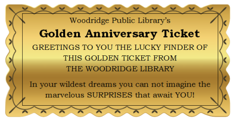 Join us in celebrating the library's 50th Anniversary. Just like Roald Dahl's story Charlie and the Chocolate Factory we'll have five Golden Tickets (winning a $50 gift card) for five lucky finders. Enjoy a chocolate bar and take your own candy tour, choosing favorite old-time candies. Freshly popped popcorn will be served at the 10 a.m. and 1 p.m. showings of Willy Wonka and the Chocolate Factory starring Gene Wilder.