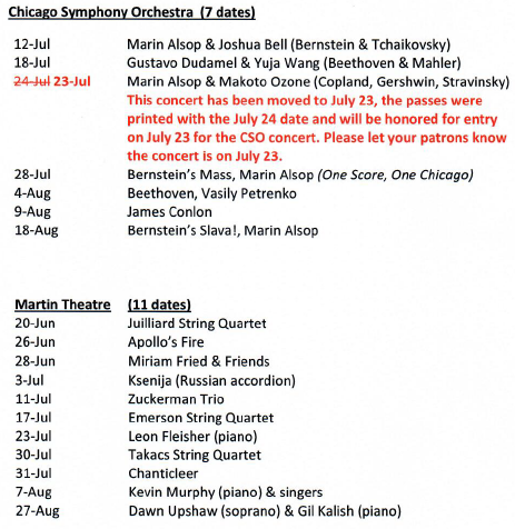 Woodridge Library has 18 sets of tickets to give away for Ravinia's 2018 season. CSO tickets have 4 tickets for each date, Theatre tickets have 2 tickets per date.