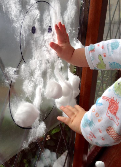 Help your baby create a textured winter scene using cotton balls and contact paper, during an art activity that uses the sense of touch.