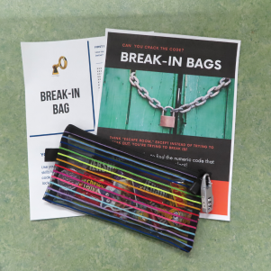 This is like an escape room in a bag. Solve the puzzles and clues to get the information needed to unlock the bag of candy. One Break-In Bag per tween or teen.